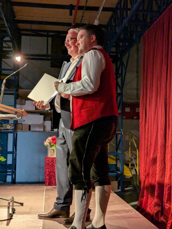 Der Erste Bürgermeister Thomas Stark (li.) verlieh Martin Lutz als 1. Vorstand in den Werkstätten der Bayerische Staatsoper den Kulturpreis Poing 2024.